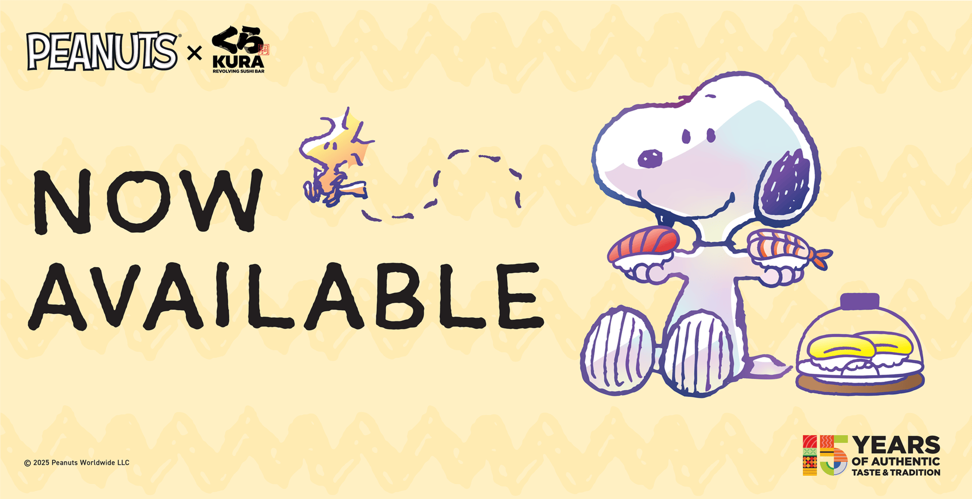 Kura Revolving Sushi Bar guests receive a single randomized Peanuts™ x Kura Sushi Bikkura Pon prize for every 15 sushi plates, while supplies last.*